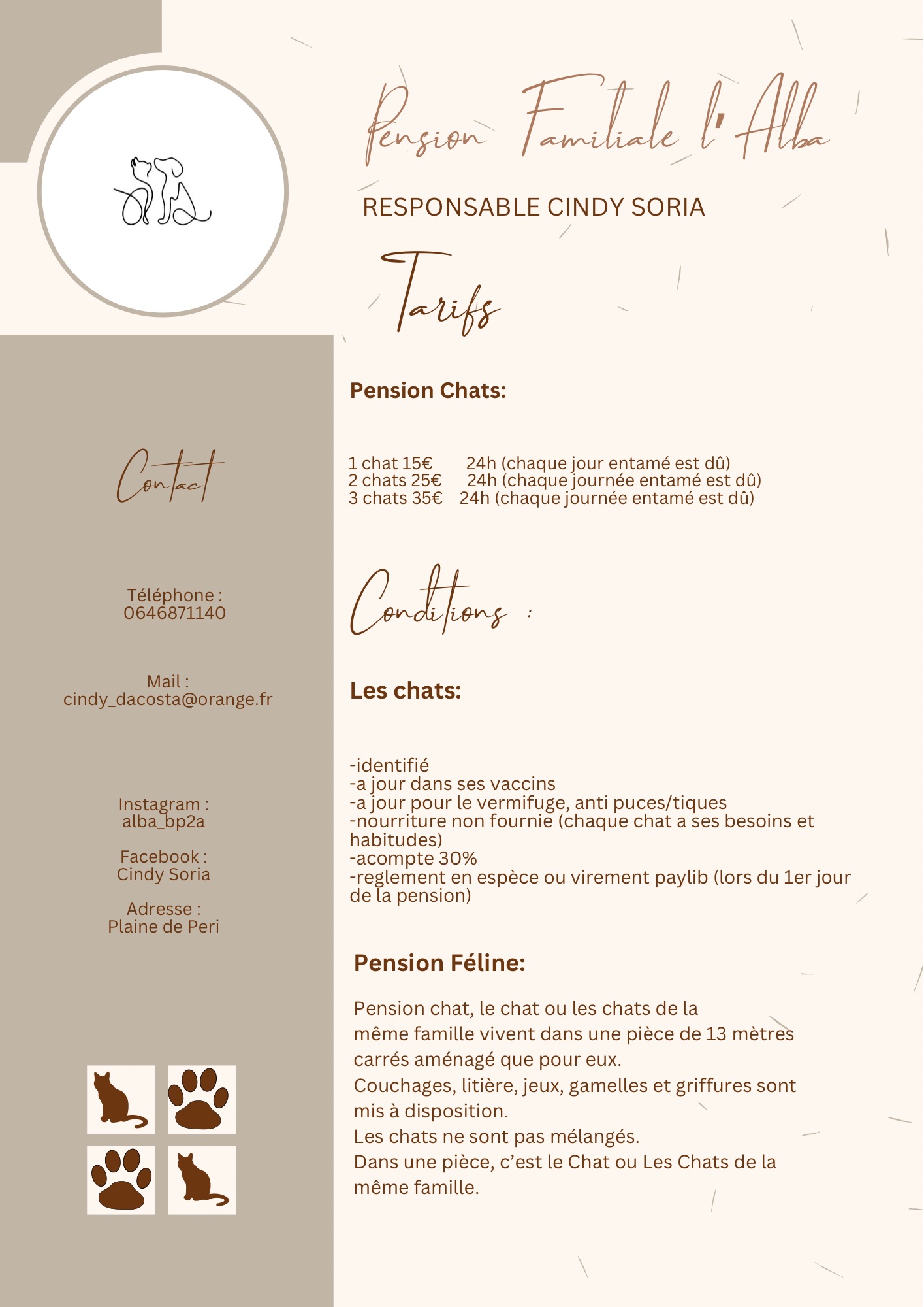 La possibilité de la garde d’un chat à la Pension Familiale L’Alba entraine l’acceptation des conditions suivantes:
